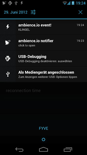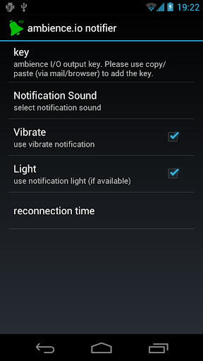 - create an Ouput on http://ambience.io/things, grab the key and paste to Notifier App config (please use copy & paste from mobile browser or mail and do not enter 40chars)