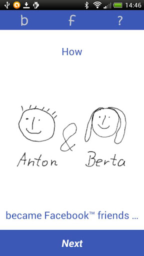 Anton and Berta meet each other at a party and - after both have opened bMyFriend - become Facebook friends with just four clicks: