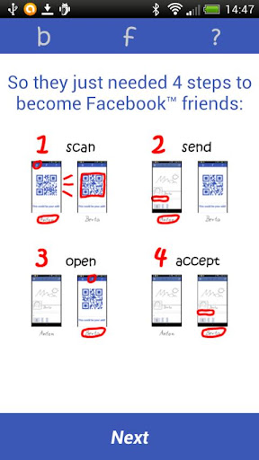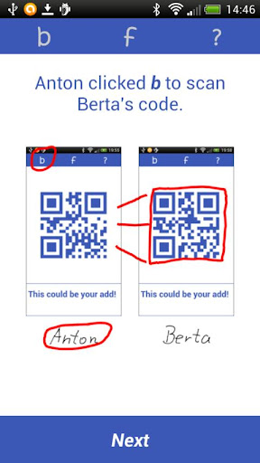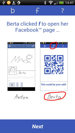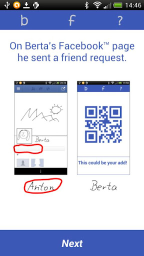 (1) Anton scans Berta’s bMyFriend code by clicking “b”. bMyFriend will open Berta’s Facebook profile.