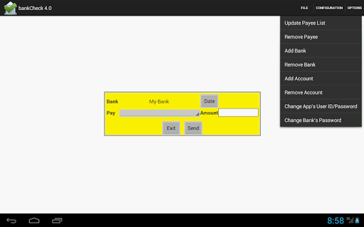 bankCheck is a fast and secure way to pay your bills. It is intended for people whose banks’ web sites are either very slow or do not have an unlimited data plan.