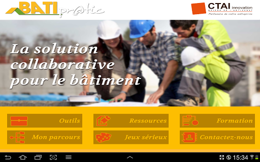 Batipratic est constitué de six rubriques correspondant à l'accès aux outils, au qizz d'autodétermination de son parcours pédagogique, à la plateforme de formation en e-learning, aux ressources documentaires, aux jeux sérieux et au formulaire de contact.