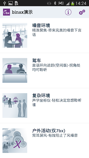使用目的: binaxDemo App是一个工具,仅为听力保健专家(如:耳鼻喉科医生,听力学家或声学专家)向患者演示binax平台的功能特性时所用。