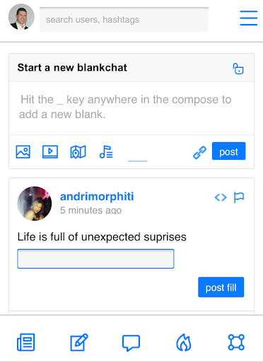 Fill in the blank. Start a blankchat to see how people complete your sentences. It's fun, easy and totally cool to have followers complete your thoughts and message.