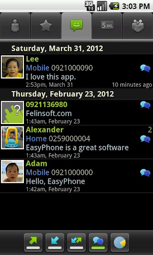 - 顯示簡訊紀錄,按群組、收到、發出分類 (再按一次通話記錄圖示)