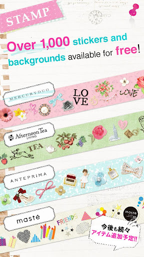 ■與時尚雜誌「nonno」「MORE」「LEE」、還有名牌「L'OCCITANE」「MERCURYDUO」「MURUA」「deicy」「X-girl」「Afternoon Tea LIVING」「Mark's masté」「Cocoonist」「LagunaMoon」等合作!總計有1000種以上的貼圖、背景等素材讓您免費使用編輯!