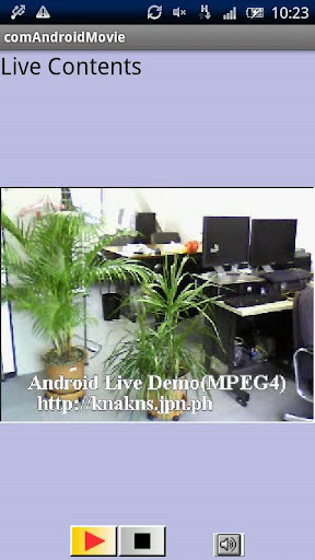 Live(from Android to Android):Android携帯のカメラ動画をユーザ名、パスワードを付加しMpeg-4にエンコードして、別のAndroid携帯に配信する。音声はマイク音声をG.711にエンコードしする。もちろん、同じAndroid携帯で受信することも出来る。Android携帯は受信して再生する。