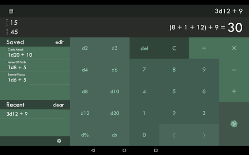 A calculator and dice roller for table top games. Enter any combination of die and get the result instantly. It can be as simple as "1d4" and as complex as "(3d100 + 5d7) x 3d2". No need to add up all the numbers yourself. d20 Calculator is a useful tool for any RPG or tabletop game.
