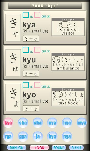 Hiragana characters you have trouble learning can be marked with the Check button. The ones marked with Check also change their color to help you identify those you have not mastered yet.