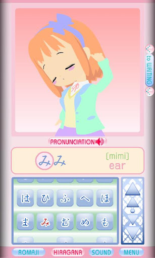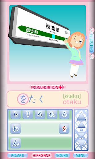 This app is designed to help you learn Japanese Hiragana characters. Each character comes with a word usage example containing a cute (Kawaii) Japanese Manga picture. Pronunciation for each Hiragana and word examples are recorded by a native Japanese girl.