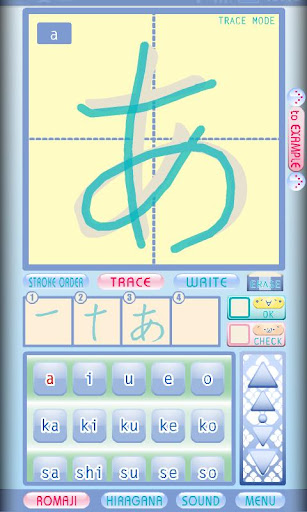 By using the OK button, you can mark the characters you mastered. A Hiragana once marked as such changes its color so that it’s easy for you to distinguish which ones you have mastered.