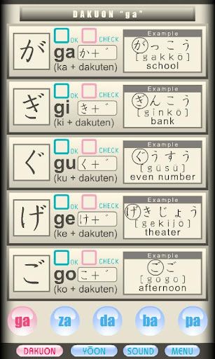 Hiragana characters you have trouble learning can be marked with the Check button. The ones marked with Check also change their color to help you identify those you have not mastered yet.
