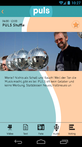 Achte einfach in der Programmübersicht auf die runden Symbole: das Mikrofon, den Fotoapparat, die Videokamera, das Text- oder das Voting-Symbol. Überall, wo diese Symbole erscheinen, kannst Du Audio-Kommentare und Interviews aufnehmen, uns Bilder und Videos direkt aus deinem Smartphone schicken, uns Deinen Kommentar schreiben und an Umfragen teilnehmen. Nie war es leichter, sich am Radioprogramm von PULS zu beteiligen!
