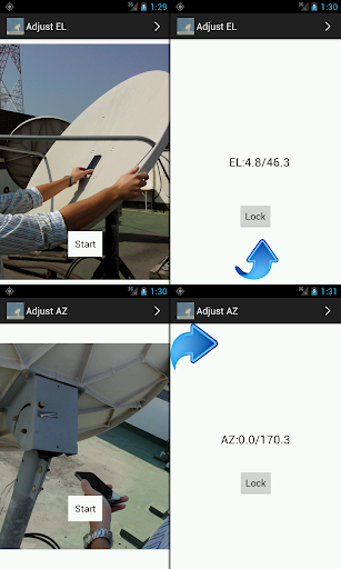 - Find the azimuth angle (AZ) of satellite dish. Hold mobile on back of plate to get away from the plate about 10-15 cm. rotating satellite dish to the left or right to the correct angle. User can see the arrow on the screen or listen to the audio.