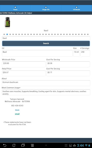 This app was created by an independent Wellness Advocate with doTERRA for help in the business. Each oil can be selected individually, and the app will list wholesale and retail pricing both by the bottle and per drop. Additionally, it lists the common usage/application of each essential oil.