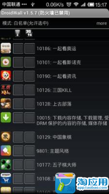 Android 网络防火墙,是一个强大的 iptables的 Linux防火墙。它可以帮助你设置你的程序是否可以访问网络(2G/3G和/或Wi - Fi)。 通过限制程序联网可以防止暗扣费以及一些其他的恶意行为 安装后,可以通过按menu获取帮助...
