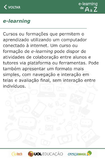 Com ele, você acessa definições simples e objetivas dos termos relacionados ao mercado de e-Learning. Uma grande variedade de expressões e conceitos, além de uma visão atual do mercado de e-Learning fazem deste um aplicativo essencial para quem atua na área.