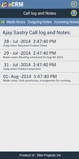 Use eCRM to keep track of all calls and notes made to your business or personal contacts with this easy to use and light weight CRM native mobile application. Useful features, like call recording, notes recording, send email information to external email ID's are easily configurable, based on individual user preferences.