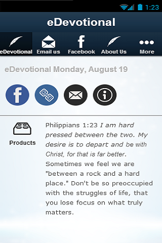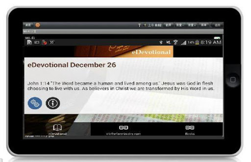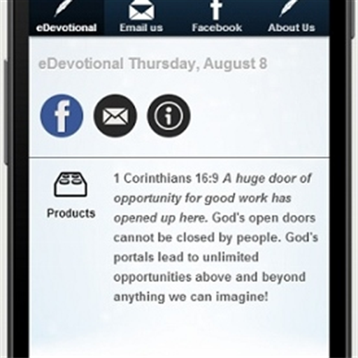 eDevotional is a fast and simple way to read a scripture verse and a one to two sentence relevant devotional thought. Perfect way to begin the day with a positive ten second word from God's Word. Convenient, quick and uplifting!