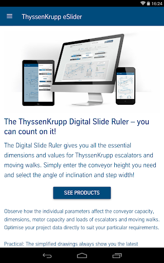The Digital Slide Ruler gives you all the essential dimensions and values for ThyssenKrupp escalators and moving walks. Simply enter the conveyor height you need and select the angle of inclination and step width!