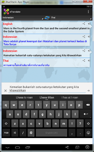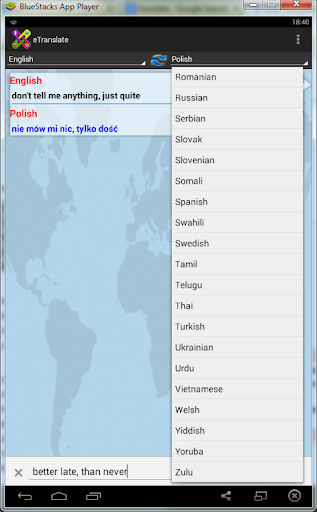 eTranslate is an online translator android based application that is very easy to use. eTranslate supports more than 80 major languages in the world . eTranslate supports Android API v10 (Gingerbread) - API v19 (KitKat).