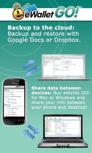 Plus, with eWallet GO! backing up and restoring your wallet is a snap. Just use Google Docs or Dropbox and you'll be able to save your wallet file easily. Not only can you back up and restore your wallet to your Android, but if you also purchase eWallet GO! for Windows (available from our website as a separate purchase) you can back up and restore between your phone and your PC. Keep your info up-to-date and access it from home or on the go!