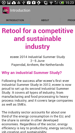 Many companies and public institutions send staff to the eceee Industrial Summer Study for three days of intense training in energy efficiency. Here, they meet experts with up-to-date real knowledge of energy efficiency, both in terms of technology and policy. The week will help participants to better understand what works and what doesn’t – and this App will help you to keep track of all the events that take place at the Summer Study. The App will be updated during the Summer Study as informal sessions develop as well as after with presentations etc.