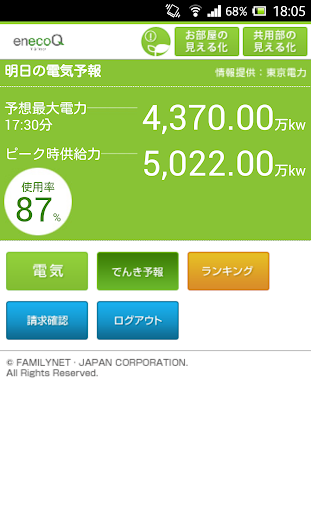 ・でんき予報:地域電力会社が、日ごとの予想最大電力と供給量を表示し、需給状態の見通しが解説されるサイトを表示します。