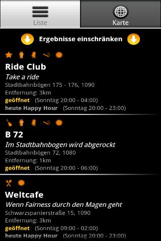 Wohin heute? Welche sind die besten Bars, Restaurants und Clubs der Stadt? Wo wird heute ein Live-Konzert gespielt? Welcher Events und Partys finden heute statt? Welche Location ist in meiner Umgebung? Wann hat sie geöffnet? Wo ist gerade Happy Hour?