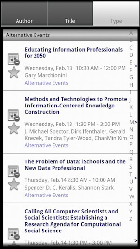 The mobile version of Conference Navigator for iConference 2013, (http://www.iconference.ischools.org/iConference13/2013index/). The app allows to view conference schedule, presented papers, workshops, tutorials, and keynotes. You can mark and schedule papers you liked and interested to attend and the system will recommend more. The schedule is being synchronized with the Web version of the Conference Navigator (http://halley.exp.sis.pitt.edu/cn3/legacy.php?conferenceID=98).