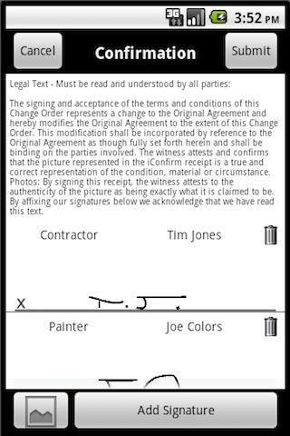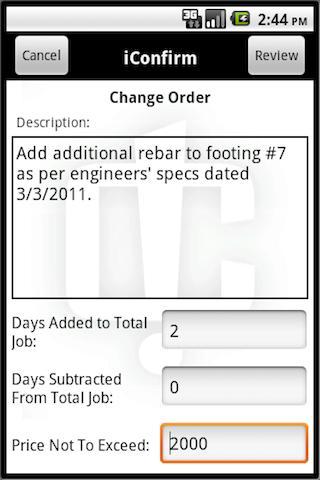 "As a General contractor I often find that the majority of my problems come with Change Orders that take place in the field. I can't count the number of times I have had verbal agreements with homeowners, gone ahead and preformed the work that we had agreed upon, only to have the homeowner start negotiating with me after the work has been completed. I have also had one or two times where the homeowner has flat out stiffed me on verbal contracts. iConfirm solves this issue for me. I now simply type in the desired changes into the iConfirm app. the amount that the change will cost and the length of time the change will take. iConfirm then turns this information into a standard change order format and allows me to get a signature from the homeowner directly on my phone. It then emails the clients and myself a copy of the signed change order in PDF format.