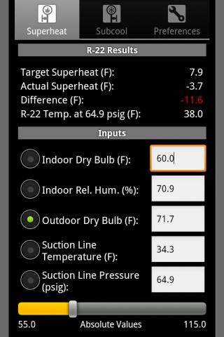 1. Perform superheat refrigerant charge calculations for 75 different refrigerants. Input the indoor wet-bulb and outdoor dry-bulb temps. to get the target superheat temperature. Then, specify the suction line temperature and pressure to get the actual superheat temperature. The difference tells you whether to charge or not.