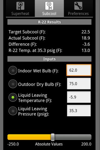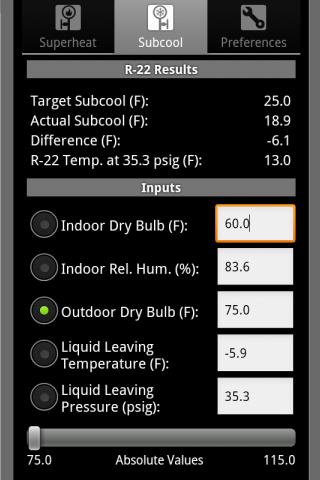 2. Perform subcool refrigerant charge calculations for 75 different refrigerants. Input the indoor wet-bulb and outdoor dry-bulb temps. to get the target subcool temperature. Then, specify the liquid line temperature and pressure to get the actual subcool temperature. The difference tells you whether to charge or not.