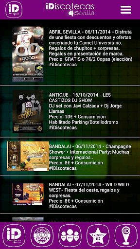 iDiscotecas Sevilla app llega para ser tu elección en la noche de Sevilla. Podrás informarte en tiempo real de todos los eventos que hay, donde están tus salas favoritas y sus características, contactar con los RRPP de una forma rápida y sencilla.