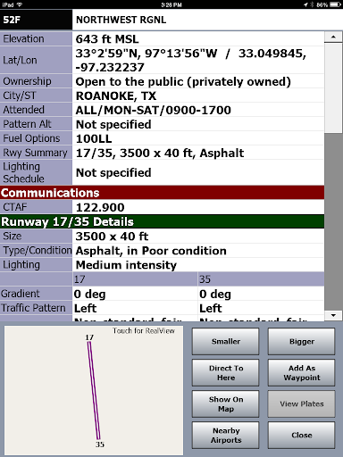 Public / Private Airports using official databases for both Public and Private airport information. Databases update directly from the FAA Data Cycles. Create your own Custom Waypoints for those locations that are not on the charts or maps.