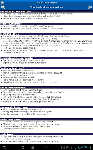 The Navigator offers quick guidance on different cultures including preferred forms of address, nonverbal communication, acculturation, culture-specific health risks, disclosure and consent, tradition and health beliefs, gender issues, approaches to decision-making, and use of advanced directives.