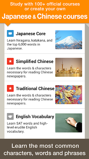 Official courses are offered for studying Japanese, Chinese, and SAT English. The Japanese Core 6000 covers the 6,000 most commonly used words in Japanese, and the Chinese Core 2000 covers the 2,000 most commonly used words in Chinese. All words have sample sentences and audio.