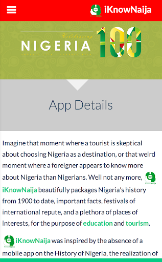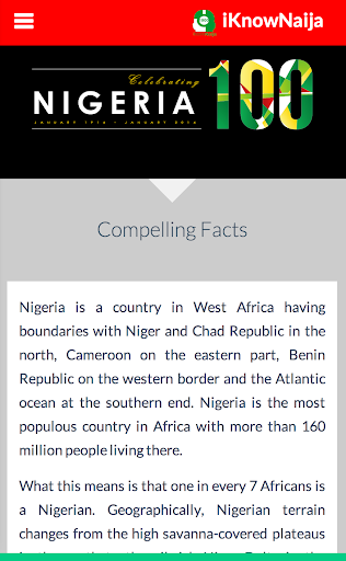 iKnowNaija beautifully packages History, Tourism (via rich festivals and places of interests), and amazing Facts about Nigeria. If you ever need on-the-spot information about Nigeria, or a tool to show you beautiful and fun places in Nigeria, then you have come to the right place.