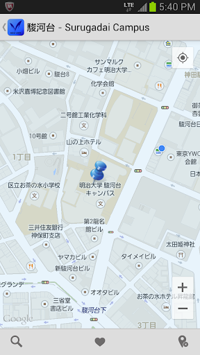 マップ - 各キャンパスの建物を名前で検索することができます。検索結果をクリックすると、マップ上にピンが表示され、現在地からの距離を示します。このマップがあれば、あなたも学内で迷子になることはありません!