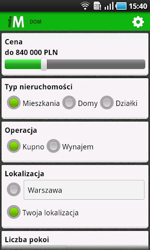 W aplikacji można przeglądać oferty według ustalonych kryteriów: ceny, powierzchni, liczby pokoi, typu nieruchomości (dom/mieszkanie/działka, kupno/wynajem). Lokalizacja użytkownika może być ustalana automatycznie (jeśli pozwalają na to ustawienia urządzenia), można też wpisać do wyszukiwarki dowolną inną.