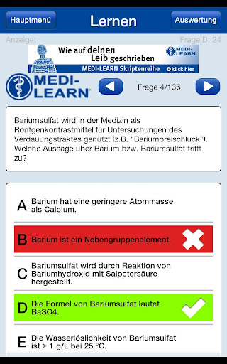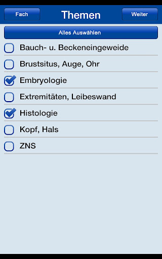 - Lernmodus: Im Lernmodus kannst du Fragen nach Fach, Bereich und Examen selektiert kreuzen. Die Themen-Einteilung entspricht hierbei der MEDI-LEARN Skriptenreihe.