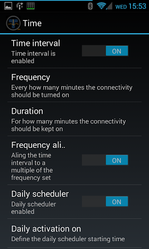 The configurable events that can activate the data connection (and WiFi in pro version) are: