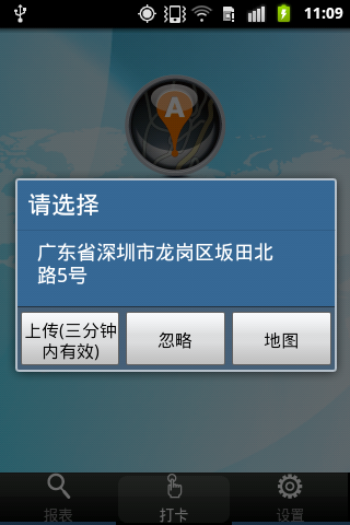 4.打卡:點擊打卡,首先會解析當前所在位置;若解析成功,會顯示地址並詢問是否上傳到伺服器或跳轉到地圖查看打卡位置。若分析失敗,則會詢問是否記錄當前經緯度,以便下次再上傳到伺服器。
