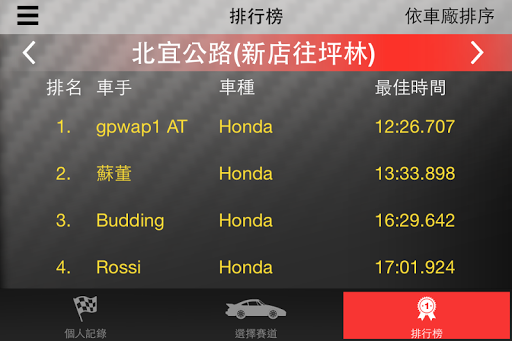 可以在最輕鬆狀態下一起分享特殊路段的最佳時間,同時自我可以了解與參考各車型最佳時間。