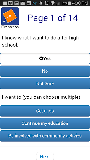 This app is for high-school aged students with disabilities with an IEP, ages 14 and older. An IEP (Individualized Education Program) details your special education services. After completing a brief 10 minute survey, the app produces an individualized “Draft Transition Plan,” based on your answers. A “Transition Plan” is an important part of your IEP document. A “Transition Plan” is your road map to transition to adult life after high school. You can then email a copy of your draft transition plan to yourself or others.