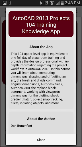 This 104 upper-level kApp is equivalent to one full day of classroom training and provides the AutoCAD using professional with in-depth information regarding project workflow in AutoCAD 2013. In this kApp you will learn about computing dimensions, drawing and offsetting an arc, the break and divide command, angular dimensions, Autodesk Seek, Autodesk360, the replace block command, working with viewports, dimensions for the plotting sheet, gradient hatch, object snap tracking, fillets, isolating objects, and more.