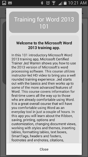 In this Microsoft Word 2013 kApp, Microsoft Certified Trainer Jed Warren shows you how to use the 2013 version of Microsoft Word. This kApp utilizes instructor-led HD video to bring you a well rounded training experience. The kApp starts out with the basics and then works up to some of the more advanced features of Microsoft Word. This kApp covers information for first-time users all the way up to those who are already comfortable using Word. It is a great overall Knowledge App that will have you comfortable using Word as any everyday tool in just a few views.