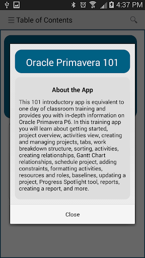 This 101 introductory kApp is equivalent to one day of classroom training and provides you with in-depth information on Oracle Primavera. In this Oracle Primavera kApp you will learn about getting started, project overview, activities view, creating and managing projects, tabs, work breakdown structure, sorting, activities, creating relationships, Gantt Chart relationships, schedule project, adding constraints, formatting activities, resources and roles, baselines, updating a project, Progress Spotlight tool, reports, creating a report, and more.