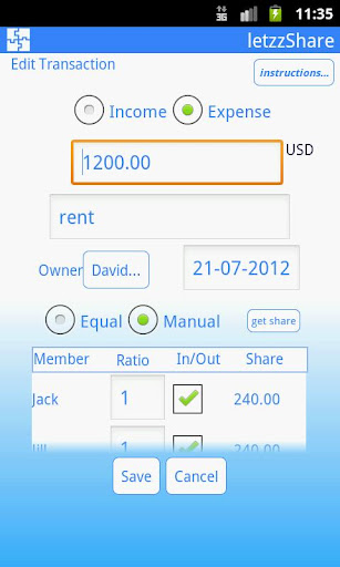 • Distribute expense/income equally among the members or manually (define ratio for each member).