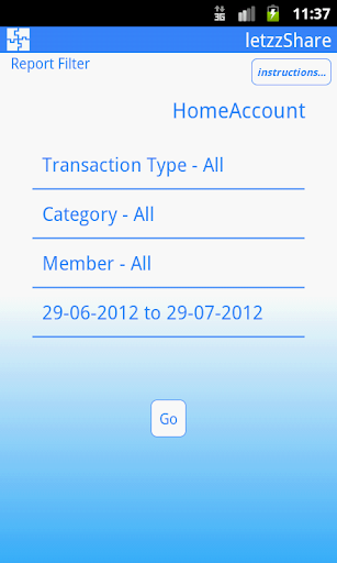 • Create reports on basis of date(for a particular period),type of transaction(income/expense), members(all or some selected members) and category(amount spent on a particular category like food, drinks, room rent etc).