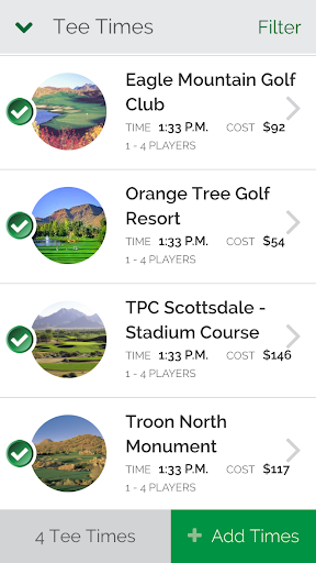 Filter tee times based on today, tomorrow, and future dates and share available times with golf buddies.